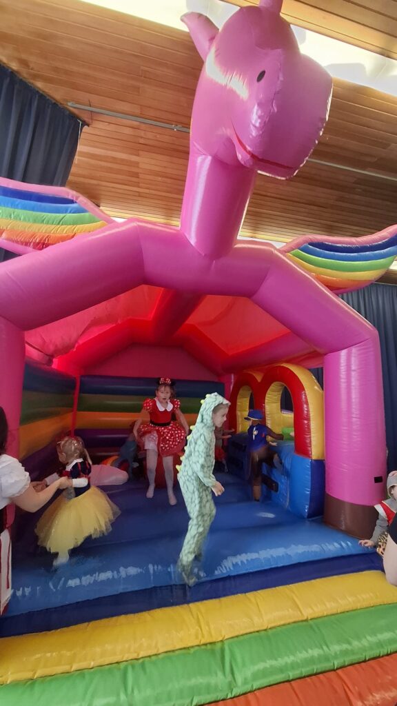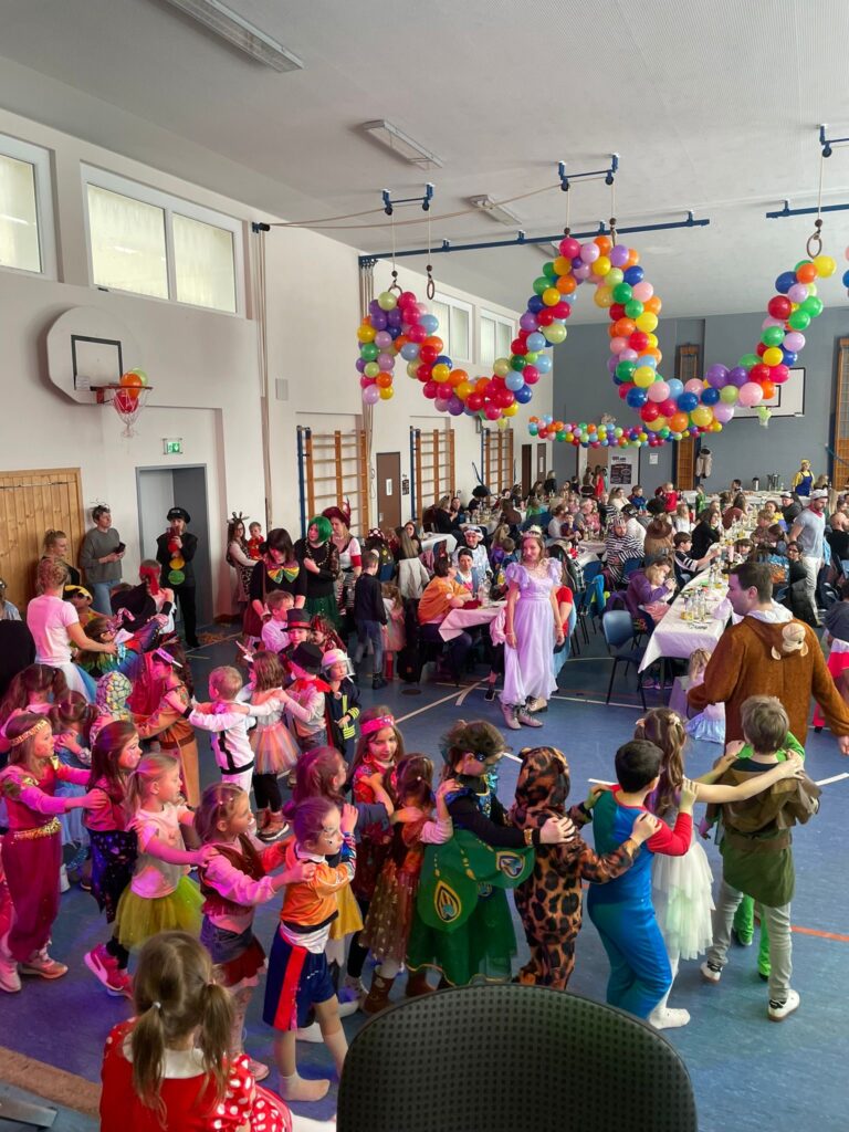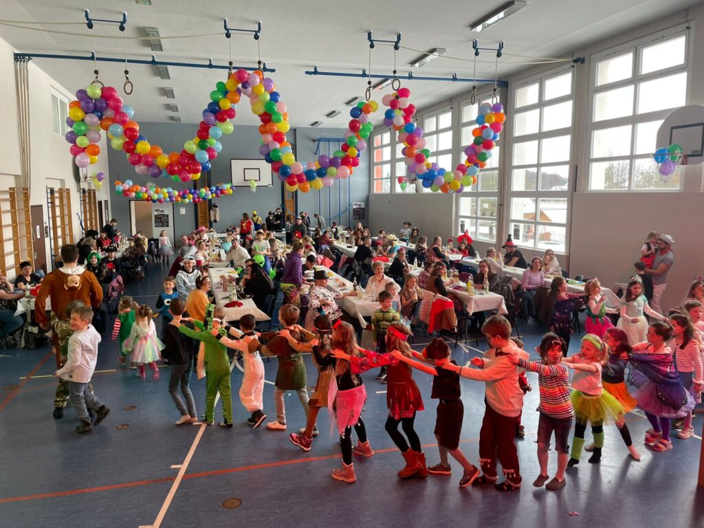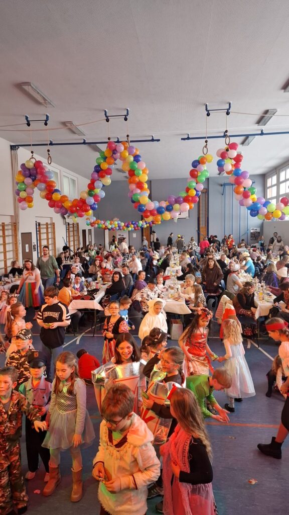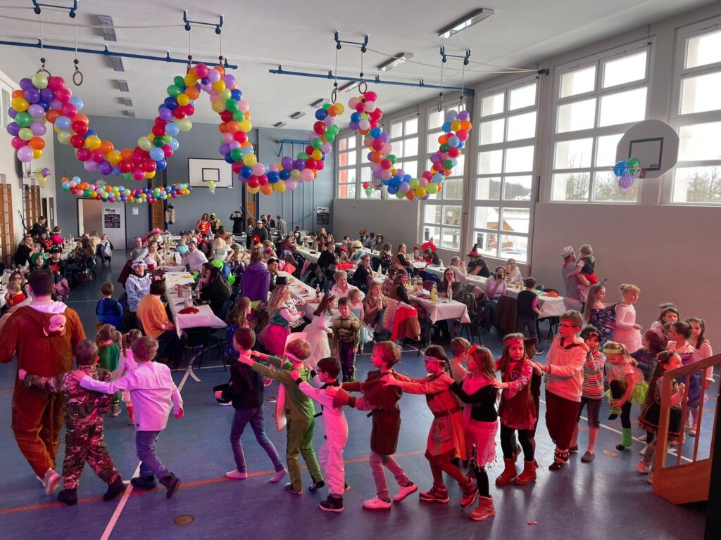 Schon 30 Minuten vor Beginn füllte sich die bunt geschmückte Turnhalle mit den ersten kleinen Narren – kurz darauf folgten zahlreiche weitere kostümierte Kinder. Die Vorfreude war überall spürbar, denn das Highlight des Tages ließ nicht lange auf sich warten: die Hüpfburg auf der Bühne.